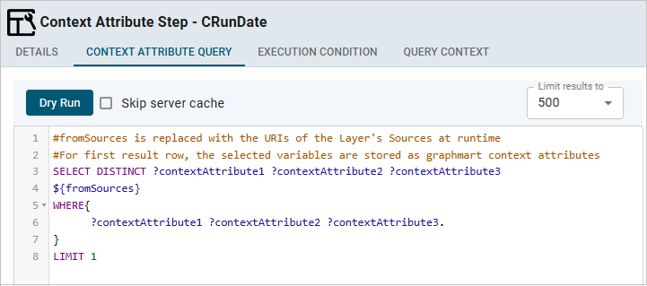 Within this step, you can introduce logic for conditional execution of steps and layers, as well as custom incremental logic. Furthermore, for all step types that involve a query, the query templates within steps and views can use context attributes as template replacements before being sent to Graph Studio.