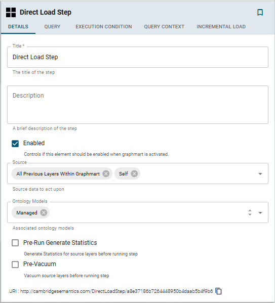 Specify a name for the step in the Title field and include an optional description in the Description field. Click Confirm. Graph Studio creates or clones the step and displays the Details tab: