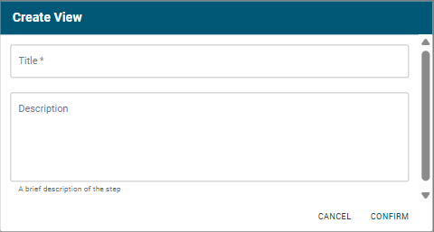3. To create a new View step, select View and then click OK. If you want to clone an existing view, click the Existing Views tab, select the view that you want to clone, and then click OK. The Create View dialog opens.