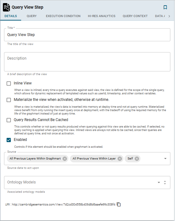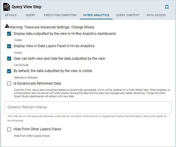 Once the Details tab is configured and the query is written, the step can be run. For information about running this step conditionally by setting up an execution condition, see Defining Execution Conditions. For details about the advanced Hi-Res Analytics settings that control how the view affects dashboards, see Hi-Res Analytics Tab below.
