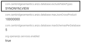 - Locate the com.cambridgesemantics.anzo.database.excludeTableTypes property (shown in the image below).