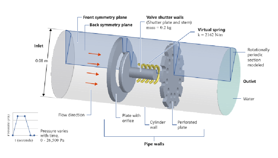 The pipe has an inlet diameter of 0.08 m and is 0.3 m long. The check-valve assembly is 0.085 m downstream of the inlet. It consists of a plate 0.005 m thick with a centered orifice 0.044 m in diameter and a shutter with an initial position 0.005 m from the opening, simulating a nearly closed condition. The shutter plate is 0.05 m in diameter and 0.005 m thick. The shutter plate is attached to a stem 0.03 m long and 0.01 m in diameter. The mass of the shutter and stem is 0.2 kg and its motion is affected by a virtual spring with a stiffness of 2162 N/m. The motion of the valve shutter is limited by a stop mounted on a perforated plate downstream of the shutter.