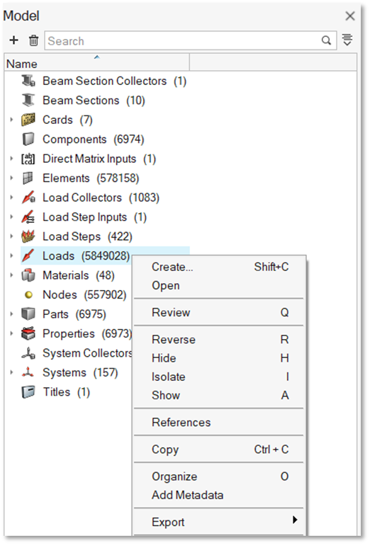 In the Model Browser, accessing the context menu on the Loads folder is