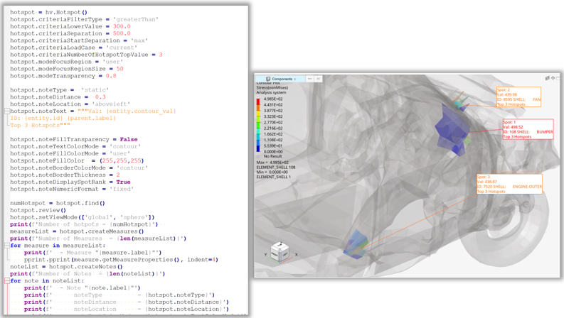 Full coverage of ignore element types and sets is supported and the hotspot notes can be customized. Using ‘local’ or ‘part’ view modes allows looping over hotspots and capturing images in combination with CaptureImageTool().