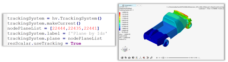 Using the Python class TrackingSystem() either a single node, a plane of a part can be used to define the tracking system. In addition, the displacements in global coordinates can be activated and rotations can be locked.