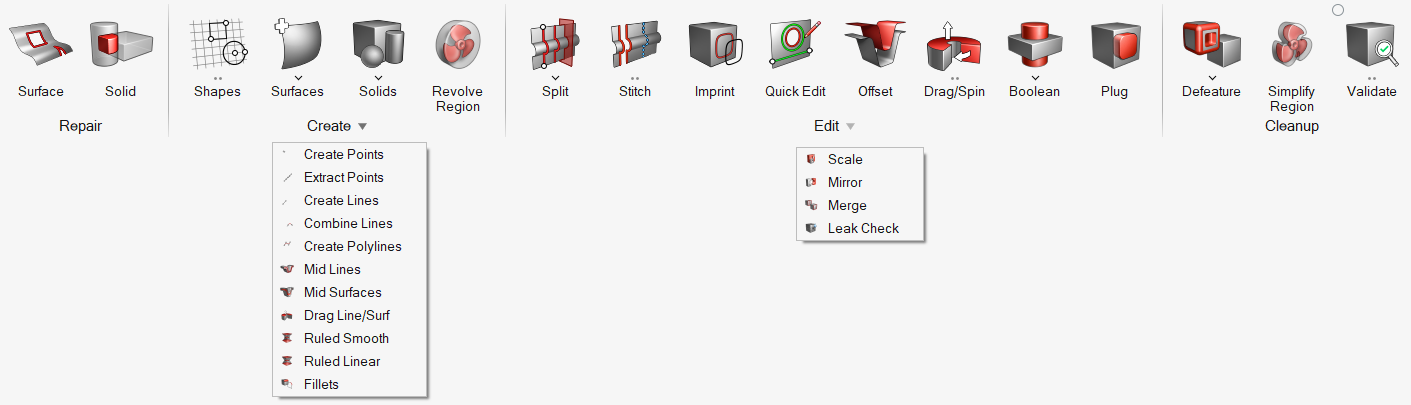 Geometry Create, edit, and cleanup geometry. Attention: The icons shown on the ribbon below are used to complete this workflow. Click an icon to learn more about the tool.