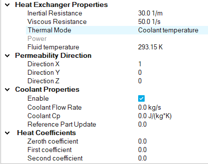 - Open the Property Editor and review the parameters associated with a particular heat exchanger by left-clicking on parts identified as a heat exchanger in the Model Browser. Heat exchanger properties that can be set include: inertial and viscous resistance, permeability direction, and thermal properties.