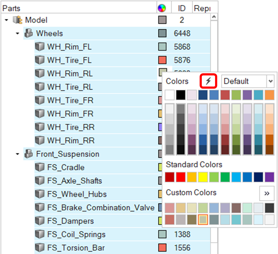 - Select the parts to automatically assign different colors or use CTRL+A to select all displayed parts.