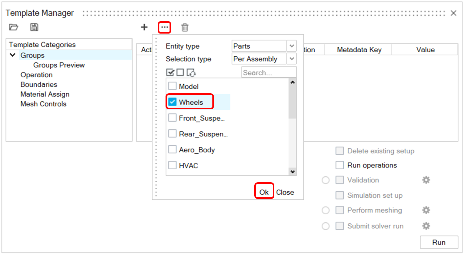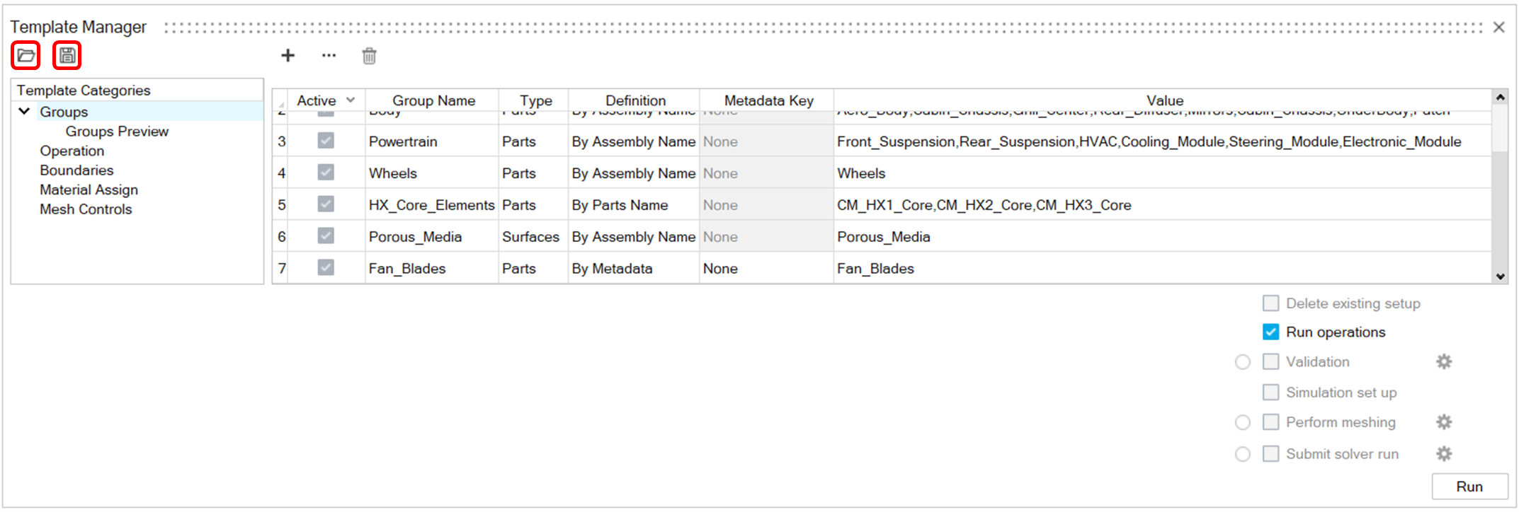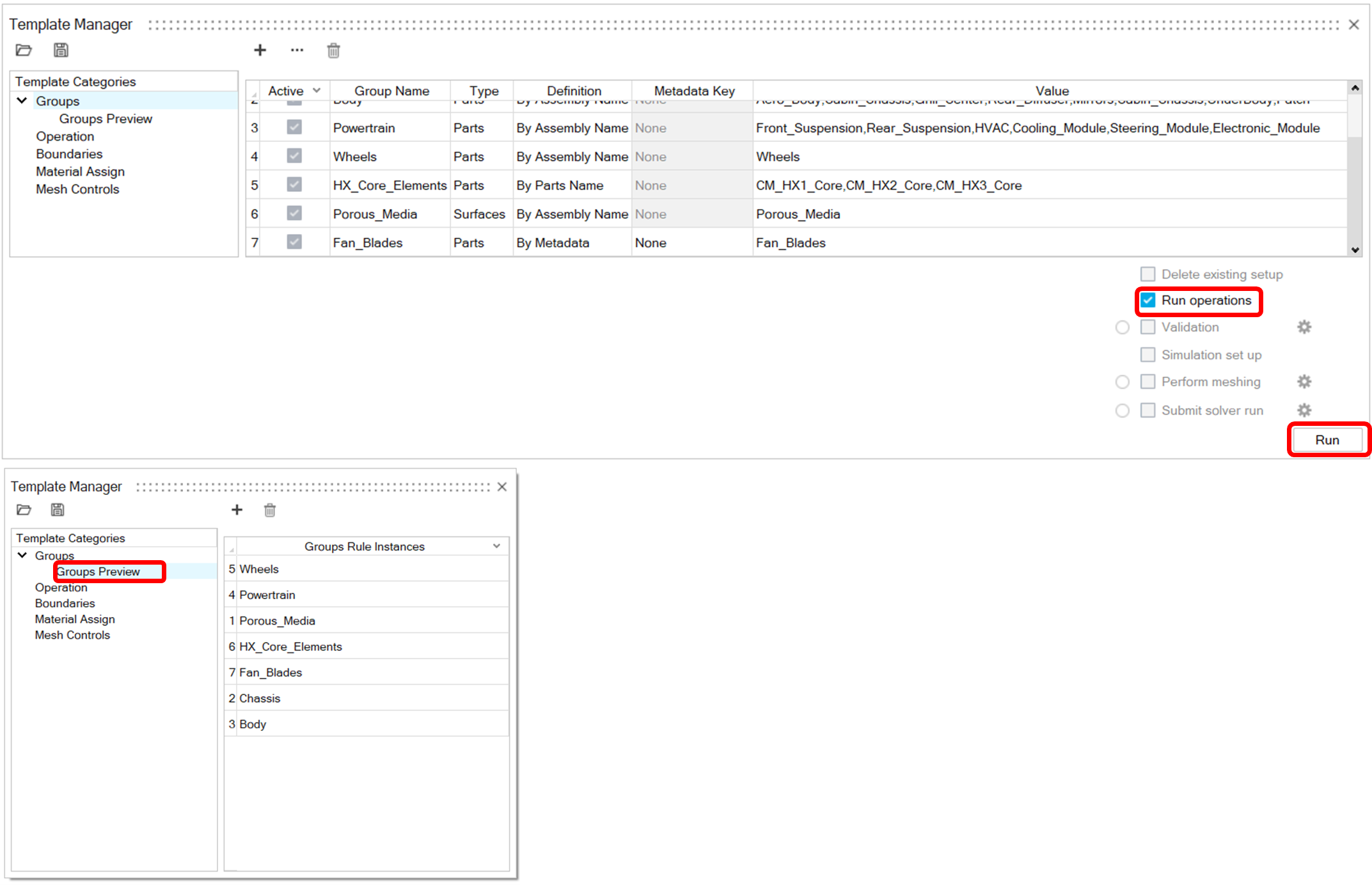 Porous_Media Surfaces Per Assembly Name Porous_Media Fan_Parts Parts Per Assembly Name Fan_Parts After defining the groups to be created, click on Run operations and then on Run to create them. Use the Groups Preview tab to see the generated groups.Figure 21.