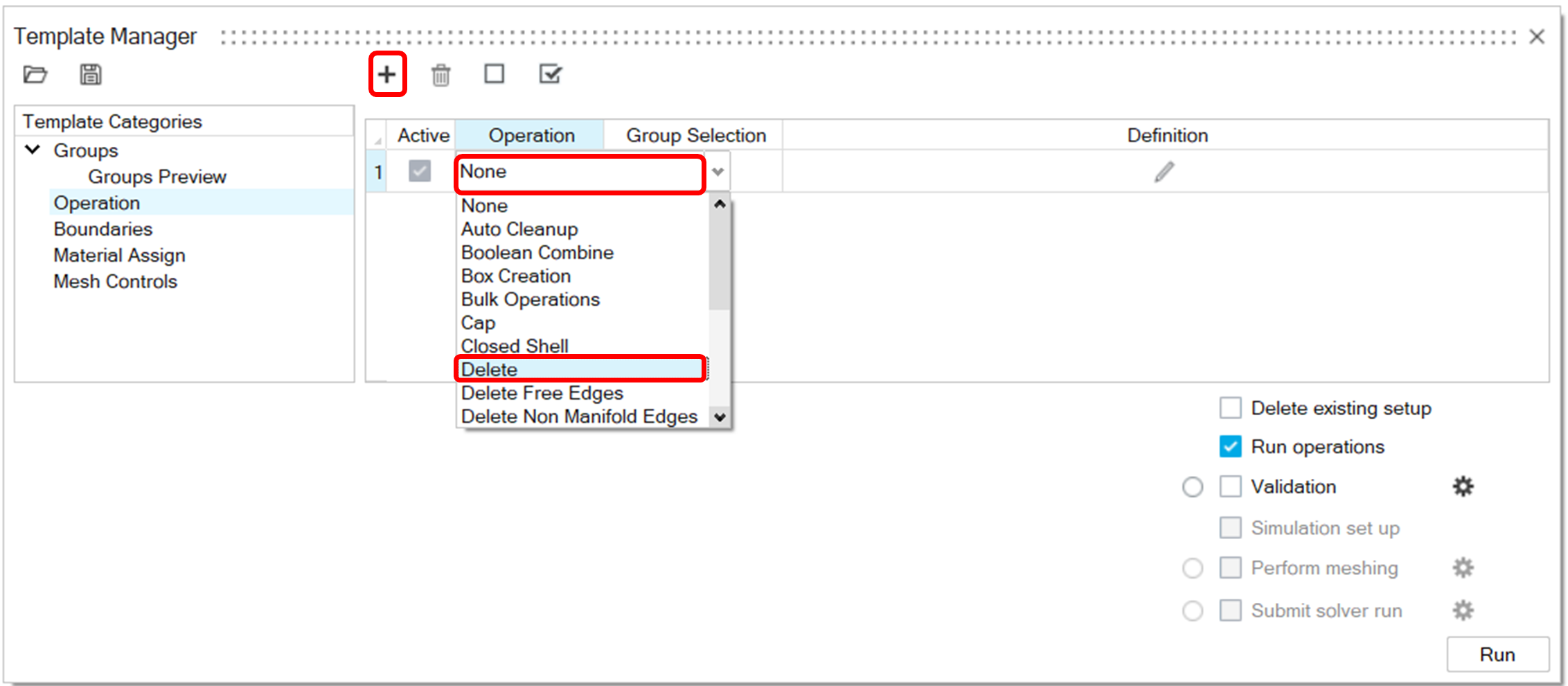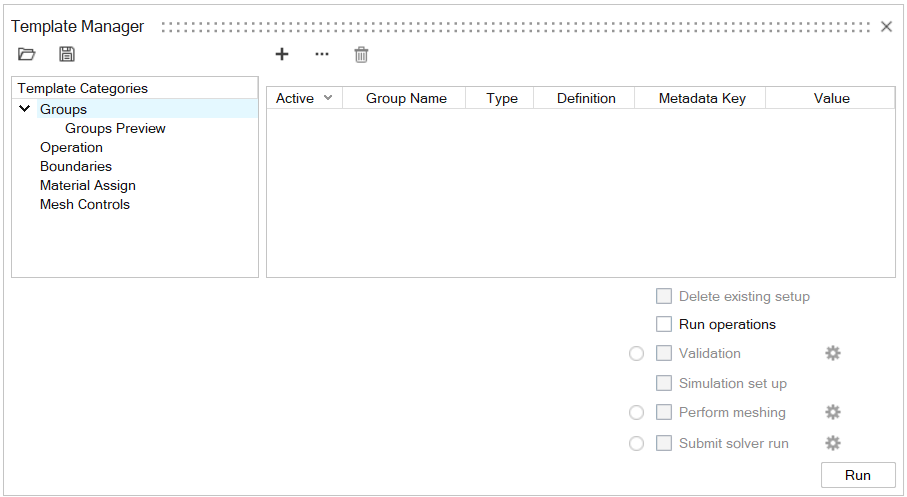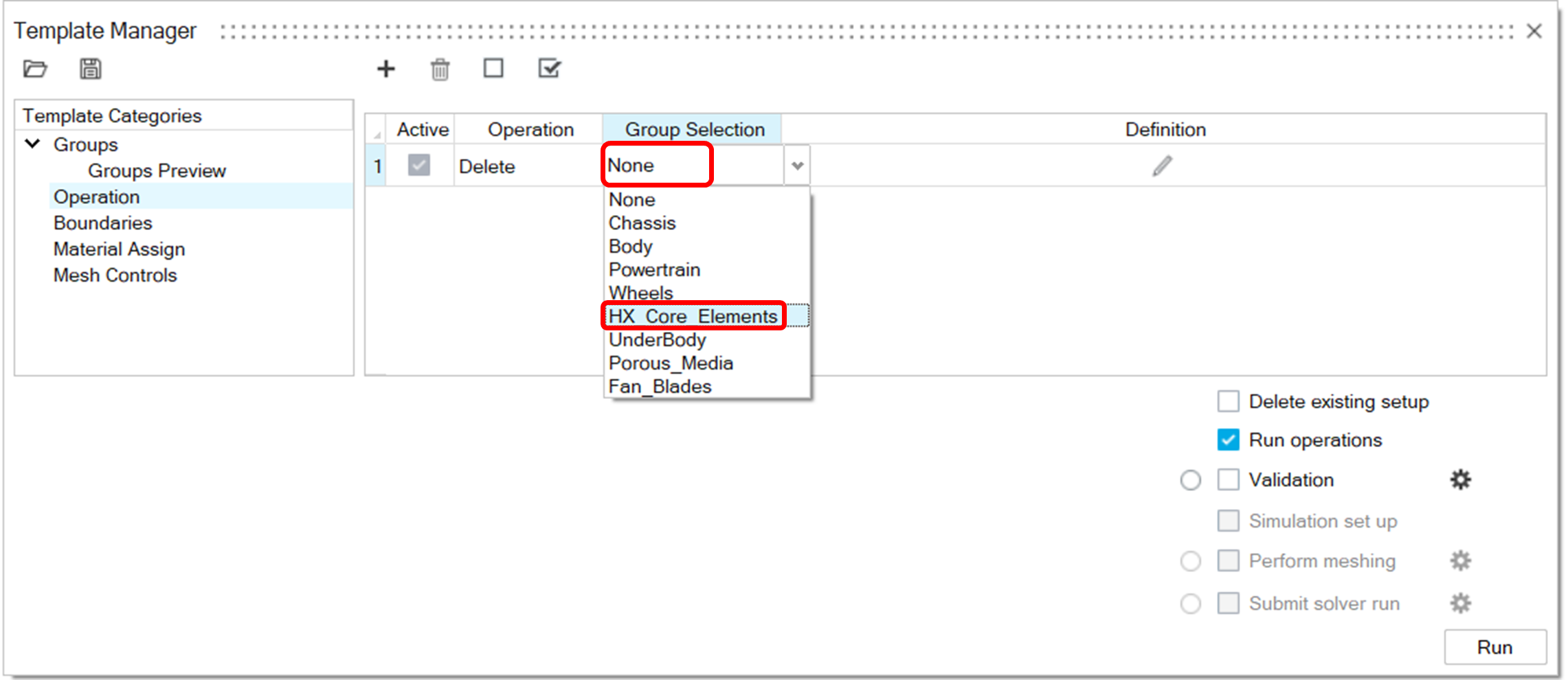 Porous_Media Surfaces Per Assembly Name Porous_Media Fan_Parts Parts Per Assembly Name Fan_Parts After defining the groups to be created, click on Run operations and then on Run to create them. Use the Groups Preview tab to see the generated groups.Figure 21.