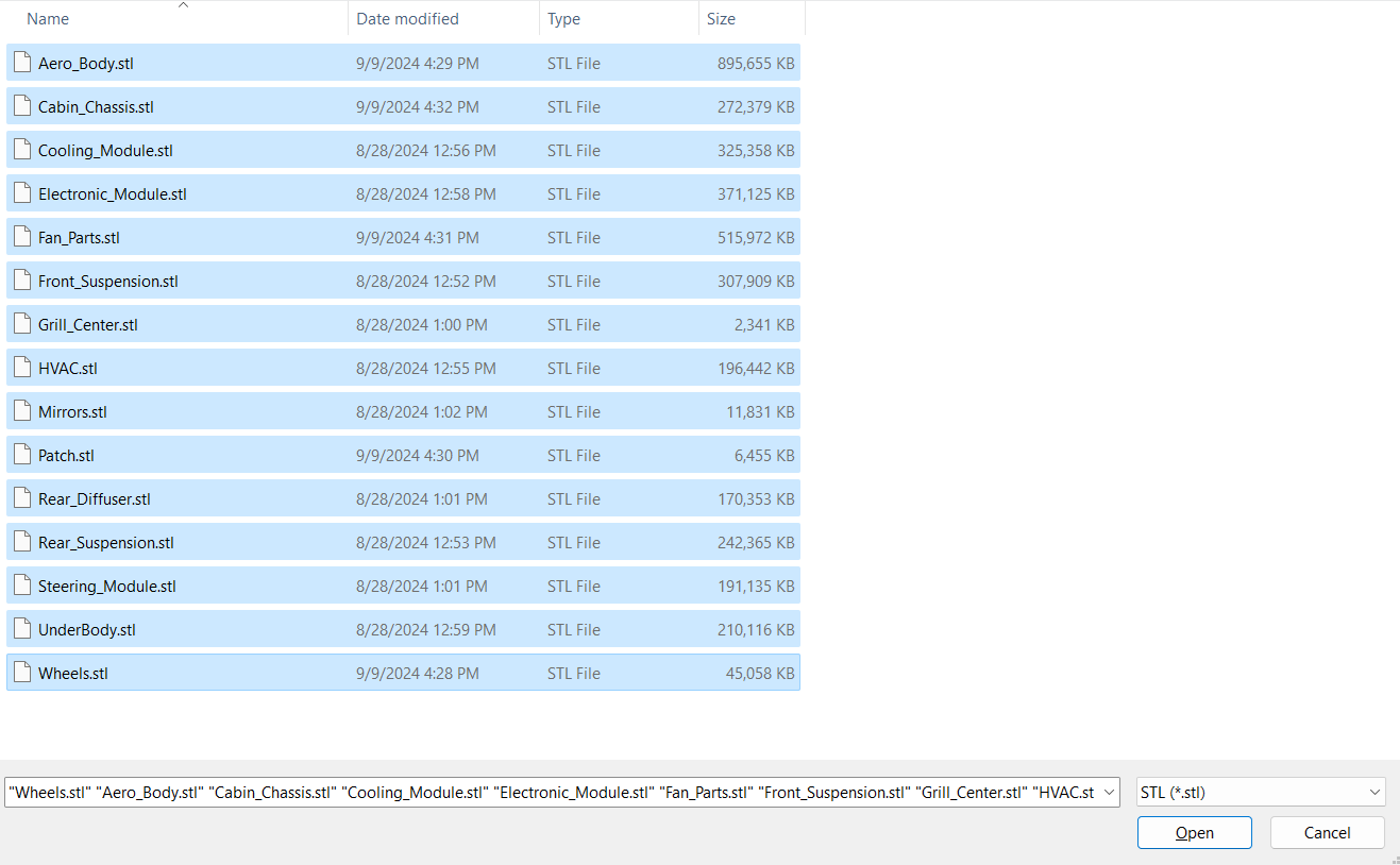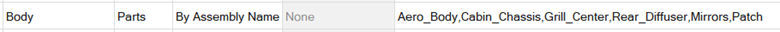 - Enter the following assembly names: Aero_Body, Cabin_Chassis, Grill_Center, Rear_Diffuser, Mirrors, UnderBody, Patch.