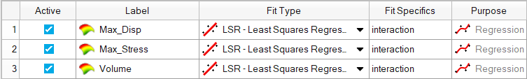 In this step you will use the 31 runs from the MELS DOE as an Input matrix and the 12 runs from the Hammersley DOE as a Validation matrix to create four Fits using Least Square Regression (LSR), Moving Least Square Method (MLSM), HyperKriging (HK), and Radial Basis Function (RBF).