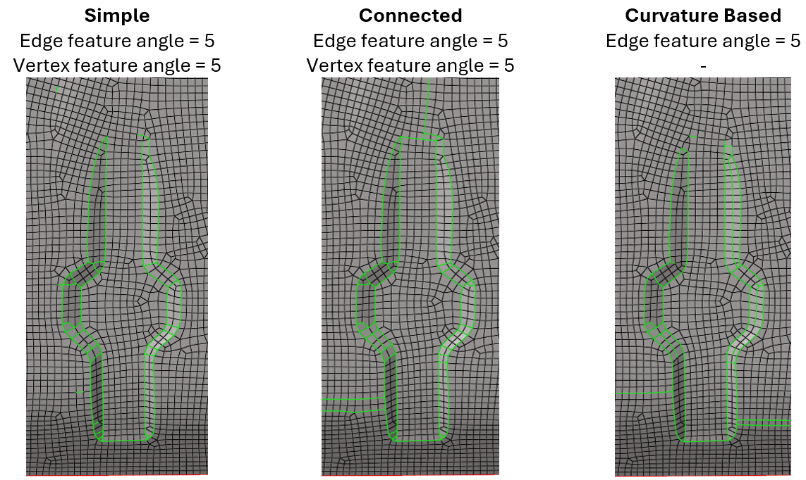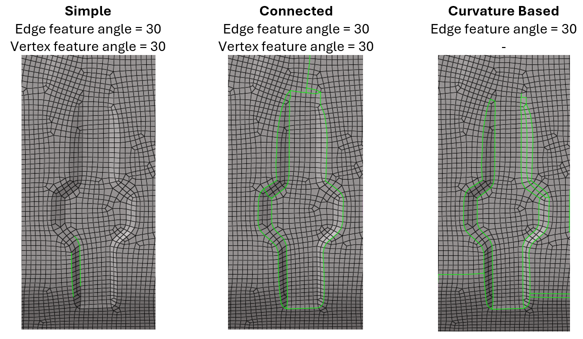 - Uses curvature analysis to detect and trace surface features by evaluating how sharply the model bends. Areas with low curvature are treated as flat, while high-curvature regions are examined using principal directions to generate smooth, meaningful lines. User-defined parameters help refine the detection in both vertical and horizontal directions, allowing greater control over feature detail and flow.