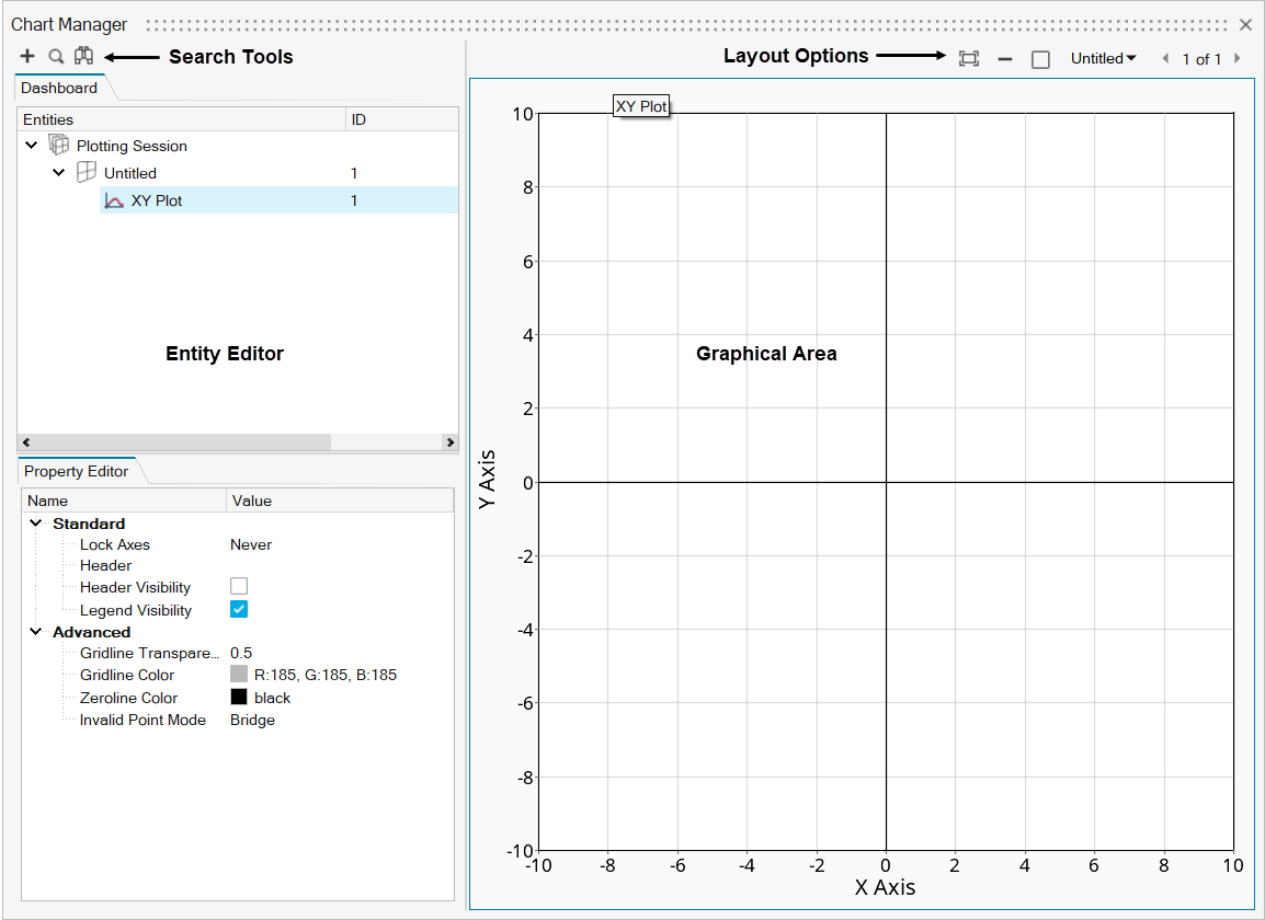Session Option Description Name Plotting session name (non-editable field). Window Option Description Name/Title The chart name. Layout The window layout for the selected chart. Plot Entity Option Description Lock Axes Choose from Never, At Import, or Always. See Axes for more information. Header Check the box to display the header on the page. Header Visibility Displays the unevaluated (Templex) expression for the plot's header. Gridline Transparency Numeric value that increases or decreases the gridline visibility. 0.50 is the default value. A lower value increases the gridlines' visibility. Gridline Color Select a color from the palette to change the gridline color. Zeroline Color Select a color from the palette to change the zeroline color. Invalid Point Mode If a CSV file contains blank spaces, select Bridge to handle the blank spaces by creating a bridge in the plotted curve. Select Gap to handle the blank spaces by displaying a gap in the plotted curve. -