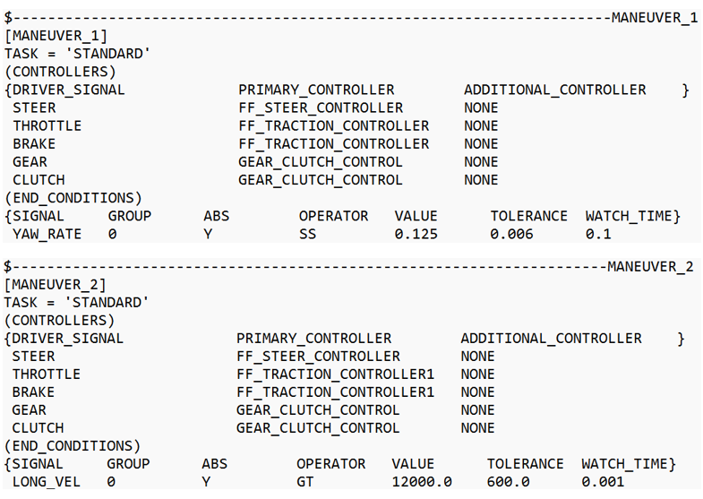 The maximum simulation time for each maneuver is calculated using the following equations:Maneuver Simulation Time Equation Maneuver 1 (Initial straight+2*Radius*Entry Angle)/Initial Velocity+5Maneuver 2 Transient timeThe actual simulation time is defined by the end conditions specified in each maneuver:Figure 3. Maneuver Blocks for a Constant Radius Event