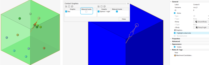 - Material Inside for a graphic indicates the graphic has material within the closed volume. Consequently, the surface normal of the geometry points outward of the graphic surface which indicates the side of contact. When the option is turned off, the surface normal of the geometry points inward. This flag is useful for reversing the surface normal to simulate internal contact.