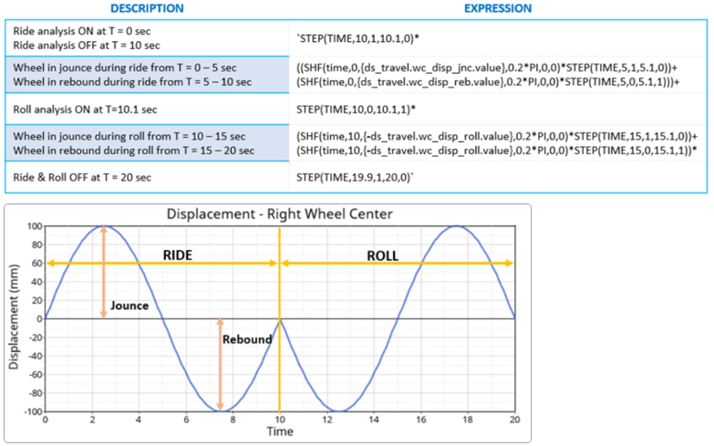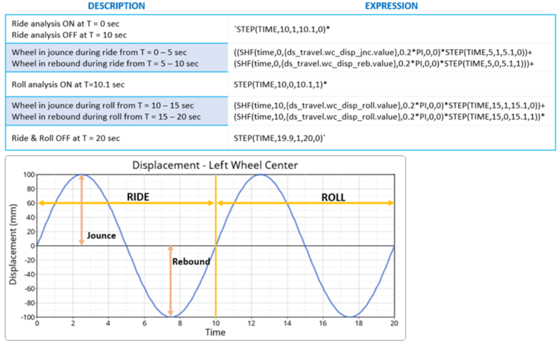 t_rideseconds:Table 1. Time in Seconds Action 0 to t_ride/4Wheels move from Design Position to Jounce Position. t_ride/4 to t_ride/2Wheels move from Jounce Position to Design Position. t_ride/2 to 3*t_ride/4Wheels move from Design to Rebound Position. 3*t_ride/4 to t_rideWheels move from Rebound Position to Design Position. t_rideRide Analysis ends. - Roll Analysis: For this part of the event all wheels
