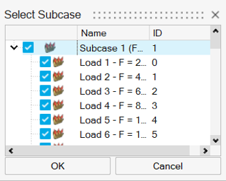 The Select Subcase dialog opens displaying a list of complex subcases and their frequencies.