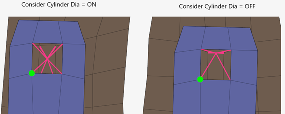 The number of elements that are selected for the realization on the loop part (red) is controlled by the width of the diameter. The diameter also controls the number of nodes selected in the penetrating part (blue).