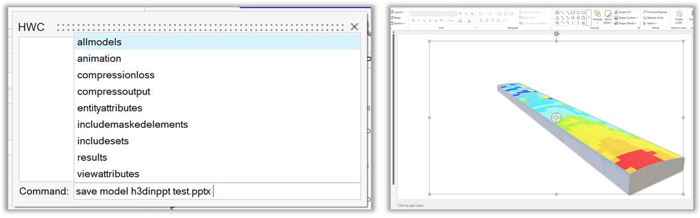 The HWC “save model” commands now support the export of H3D in HTML, H3D in PowerPoint, GLB in PowerPoint and GLB models. The recorded commands are: