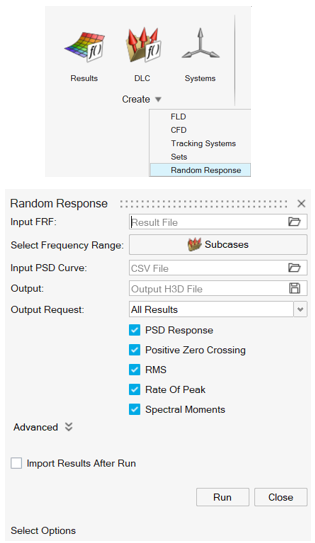 A new tool is added under the Create section to perform random response analysis using an existing FRF file. Required inputs are a result file (OptiStruct op2/h3d and Nastran op2 file types are currently supported) and a PSD curve in CSV format.