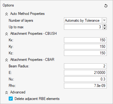 Define connection options, such as connections properties and adjacent RBE elements handling, via the Options dialog.