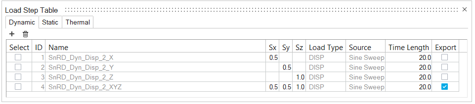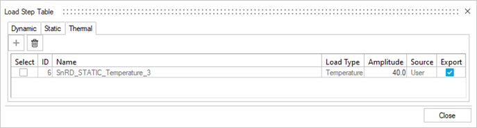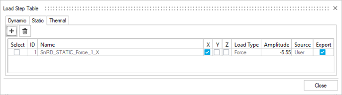 The Load Step Table dialog opens containing all the loadcases present in the session.Note: Depending on the type of event, the loadcases will be populated in the respective tabs of the table.Figure 2.
