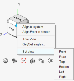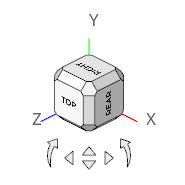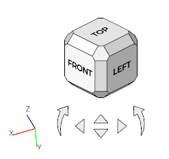 Clicking a major face (Top, Bottom, Right, Left, Rear, or Front) rotates the model to the nearest possible orientation of that face. If that orientation is not the standard, clicking the face again re-aligns the model back to the standard orientation. If the orientation is already standard, repeated clicks on a major face reverses the view.Note: The view is fit anytime a face is selected.Clicking the arrows incrementally rotates the view. Left- and right-clicking increments by + and - 15 degrees while middle-clicking increments by 90 degrees.