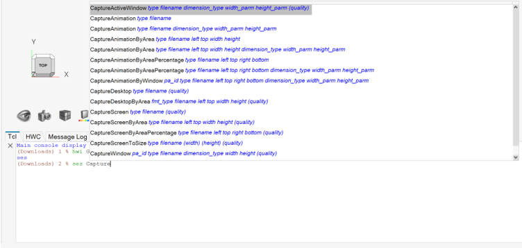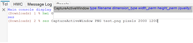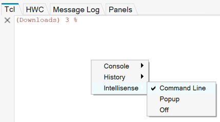 of the console. You can type commands, which contain Tcl handles, and a popup Intellisense window is