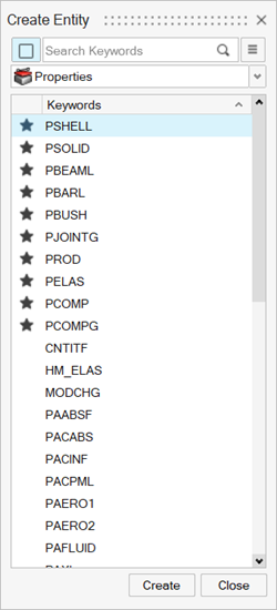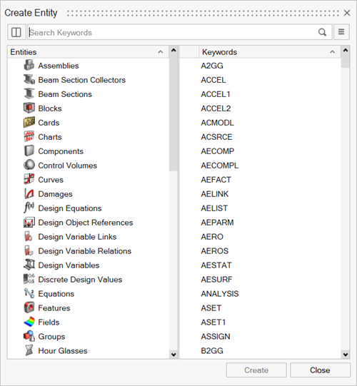 - The Create Entities dialog is a centralized and efficient interface, designed for creating entities and their associated solver keywords. The previous version of this dialog contained non-scrollable context menus, while the new user interface is scrollable and allows you to quickly create the required entities or keywords by typing or selecting from a list.