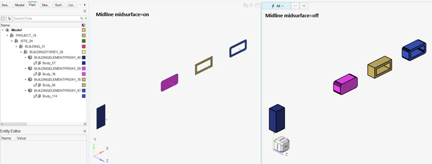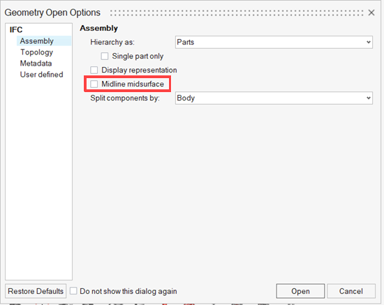 - A new option, midline midsurface, has been introduced. The midline midsurface option applies exclusively to components with geometry defined as swept solids, not BREP. When enabled, you can use the midline midsurface option to import only the axis representation, a 2D planar cross-section and its extrusion path, without generating the full solid geometry.