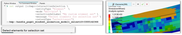 - Tcl API for Interactive SelectionIn the postquery animation APIs, a custom selection context via the ::hwp::interactiveSelection command has been added. It covers the same functionality as the Python InteractiveSelection() class introduced in v2025.0. Complex legacy scripts can be replaced by a few lines of code. Supported entity types are Parts, Nodes and Elements, selection methods are single-, list-, window- and advanced selections.