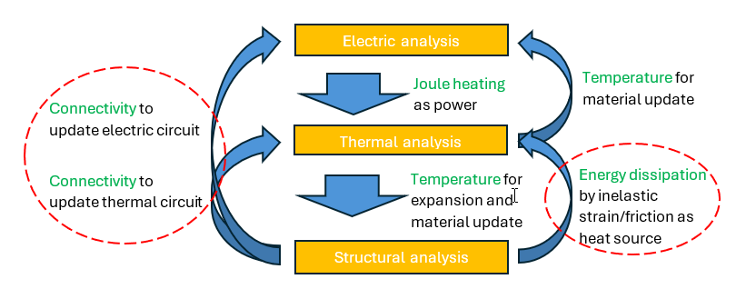 This allows a real-time update on heat transfer path and electric current transfer path due to contact status change. On the other hand, heat generated from inelastic strain can also be considered during the analysis.