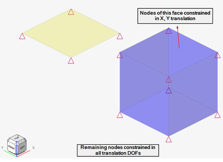 The finite element model, as shown in Figure 1, contains one solid CHEXA and one shell CQUAD4 element. The elements are subjected to dynamic, monotonically increasing shear deformation by application of the enforced displacement (via SPCD card) in the X-direction. All translational DOFs of the model are constrained except the top face of the solid element, which is constrained only in the X- and Y-directions. An enforced displacement in the X direction is applied to one face of the CHEXA8 element and an edge of the CQUAD4 element.