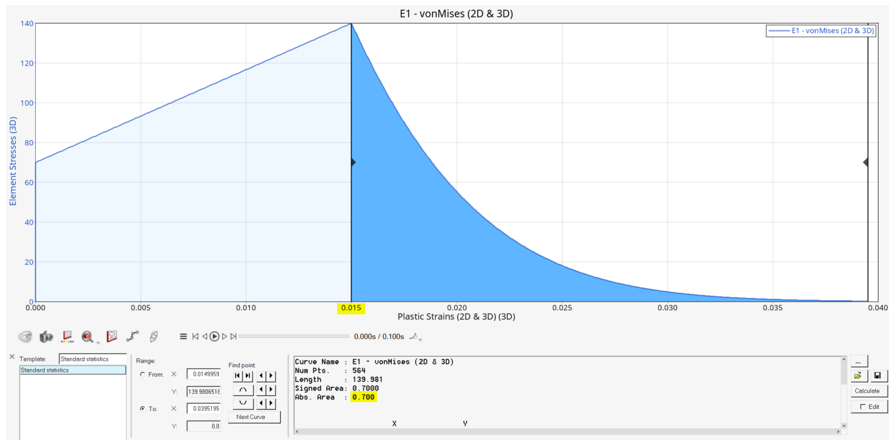 Damage evolution is specified with the DMGEVO card. In this example, the type of evolution is ENERGY and the shape is EXPONENTIAL. The unit of energy is N/m (stress N/m2 multiplied by the length m). Length is related to the plastic displacement at the ultimate failure minus plastic displacement at the damage onset. Plastic displacement is equivalent to the plastic strain multiplied by the element characteristic length. In general, DMGEVO shows mesh dependency, but in this example the characteristic length equals to 1.0. Therefore, plastic displacement and equivalent plastic strain are mutually the same.