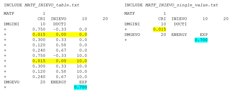 In explicit dynamic analysis, damage criterion is defined with the MATF card, where the MATF material identification number is the same as the corresponding MAT1/MATS1. The INIEVO continuation line in MATF is used to define the damage criterion. Additionally, there are two table IDs defined. The first table (DMGINI) defines the damage initiation, and the second table (DMGEVO) defines the damage evolution.