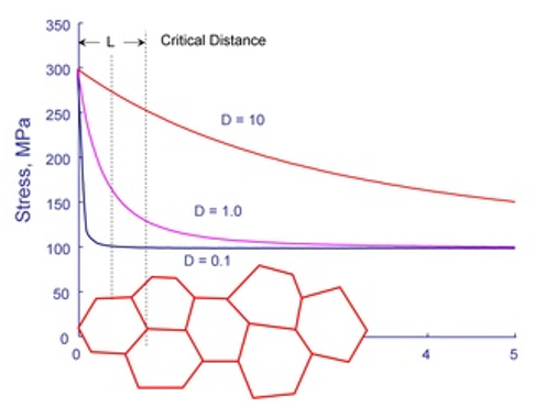 convenient way to visualize the fatigue process zone. Figure 2 shows the grain size superimposed on the stress distribution from Figure 1. What is the stress in the process zone? A simple first approximation would be to
