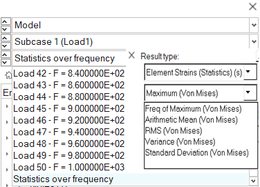 The strain statistics can be viewed in HyperView after loading the H3D file, under Statistics over frequency option at the end of the frequency list in the Results Browser. Then, various statistics can be chosen from the sub-menu under Strain (Statistics) (s).Figure 1.