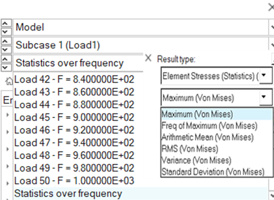 The stress statistics can be viewed in HyperView after loading the H3D file, under Statistics over frequency option at the end of the frequency list in the Results Browser. Then, various statistics can be chosen from the sub-menu under Element Stresses (Statistics) (s).Figure 2.