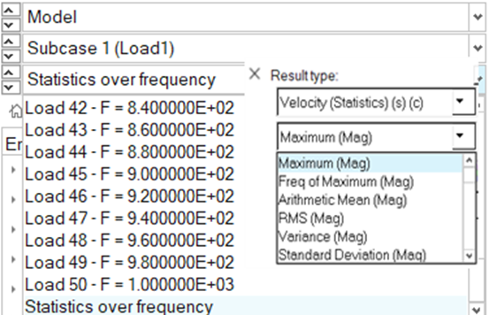 The velocity statistics can be viewed in HyperView after loading the H3D file, under Statistics over frequency option at the end of the frequency list in the Results Browser. Then, various statistics can be chosen from the sub-menu under Velocity (Statistics) (s).Figure 3.