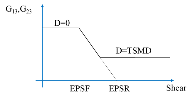 In an optional damage model for transverse shear strain, out-of-plane stiffness (G13 and G23) can linearly decrease to model interlaminar shear failure. Damage starts when effective transverse shear strain reaches EPSF. Final rupture occurs when effective transverse shear strain reaches EPSR.