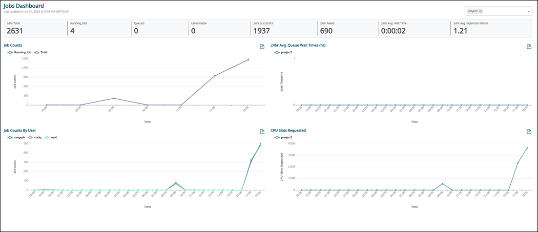 - 24hr Avg. Expansion Factor: The average Expansion Factor of completed jobs in the last 24 hours, calculated as (Queued Time + Run Time) / Run Time.