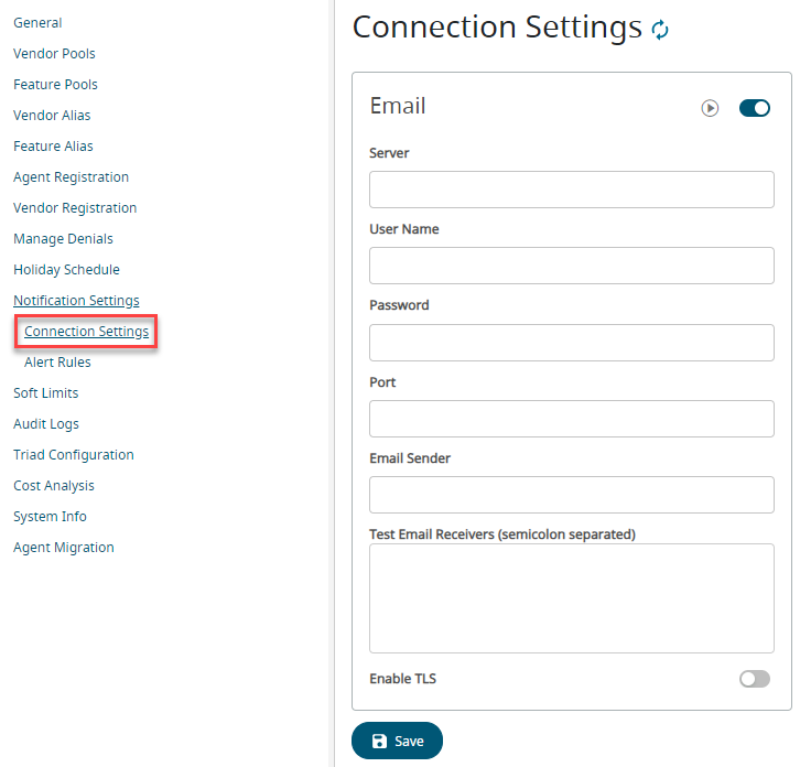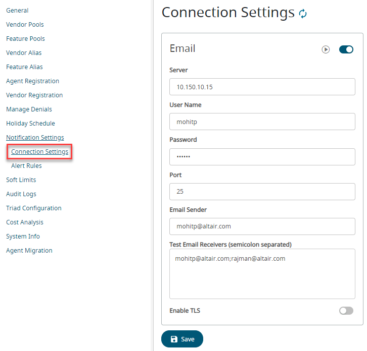 Connection settings enable administrators to configure SMTP server details and perform a dry run to test the functionality of the email notification.