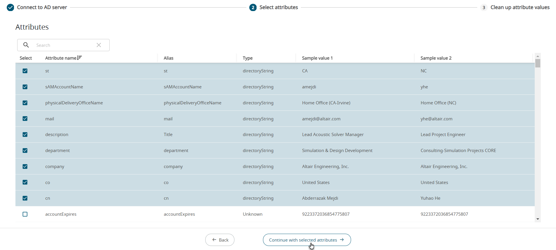 Note: You cannot remove the pre-selected data from the list.Sample values of the attributes from the AD are displayed in the list.Figure 4. Attributes Sample Values
