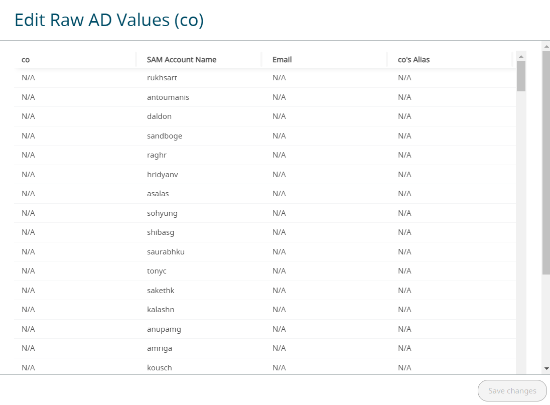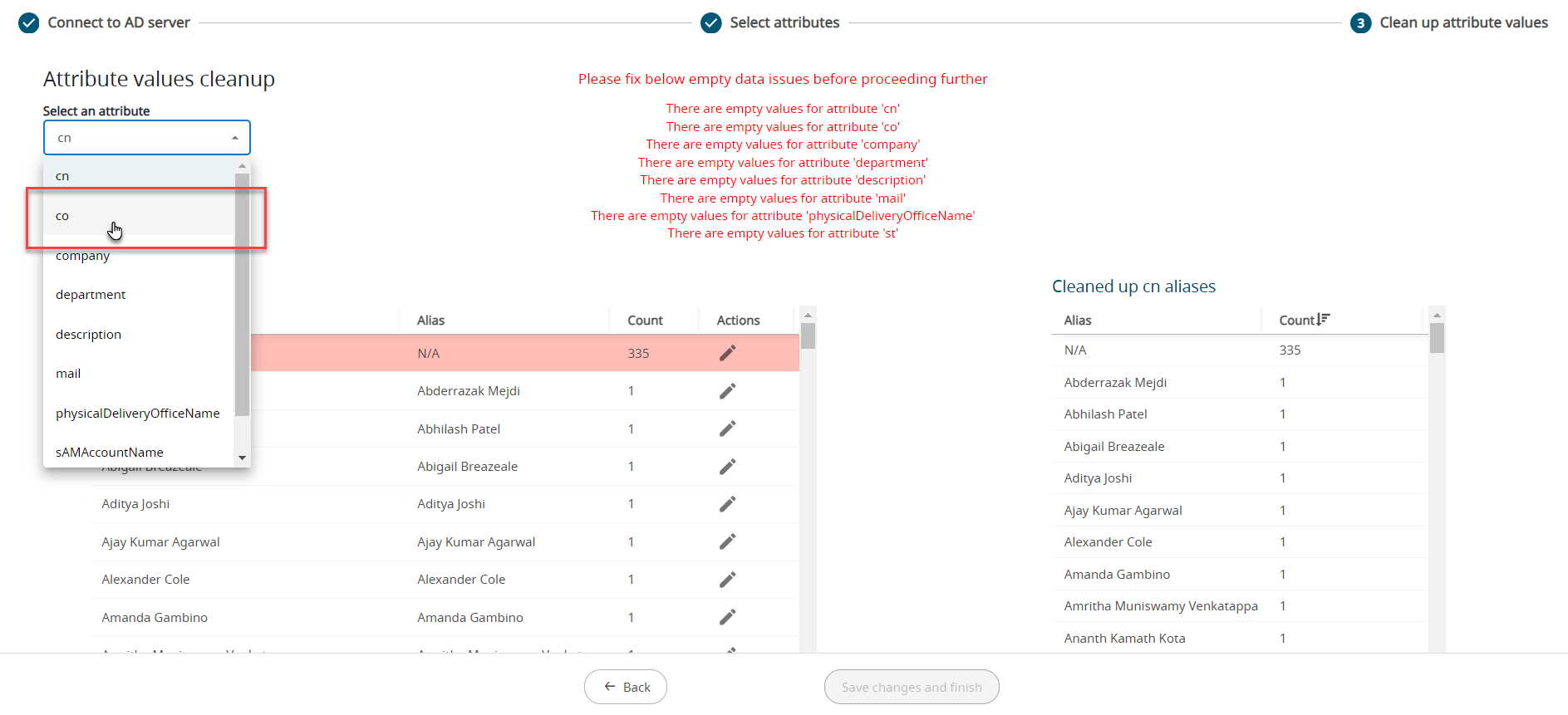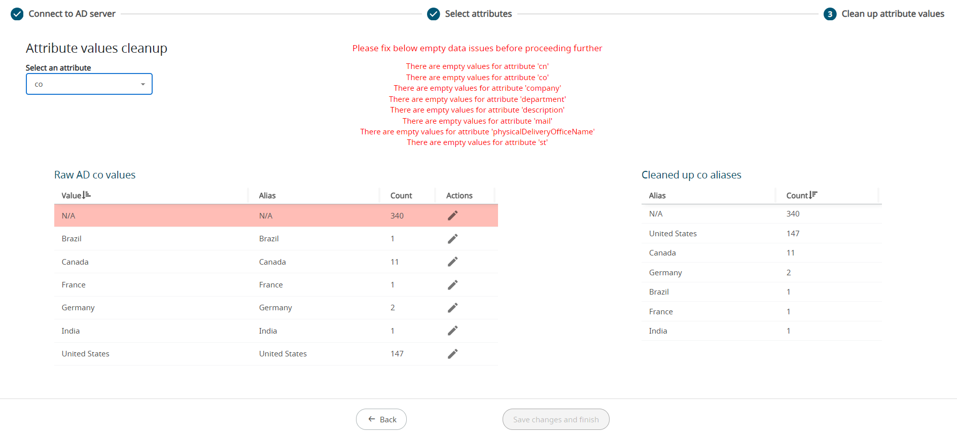 Note: The Value column is from the Active Directory. The Alias column value will be imported and used in all the reports.The message to clean up the attribute alias data before importing the AD is displayed at the top of the screen.Please fix below empty data issues before proceeding further There are empty values for attribute 'cn' There are empty values for attribute 'co' There are empty values for attribute 'company' There are empty values for attribute 'department' There are empty values for attribute 'description' There are empty values for attribute 'mail' There are empty values for attribute 'physicalDeliveryOfficeName' There are empty values for attribute 'st'