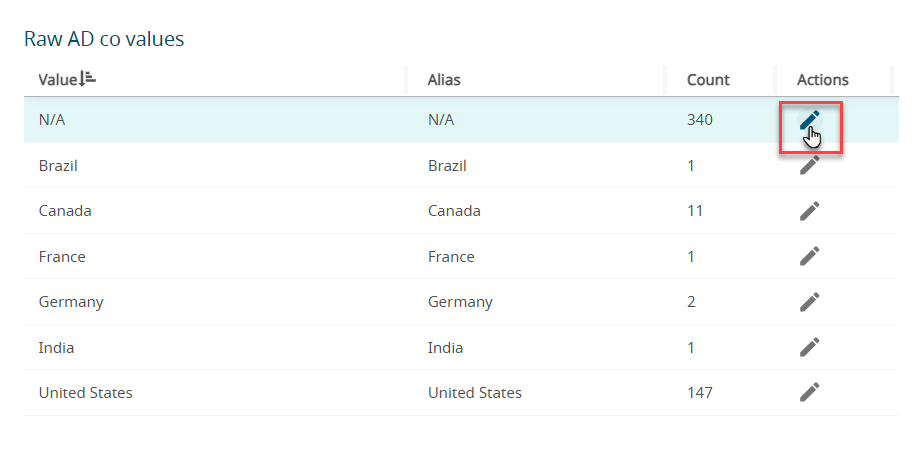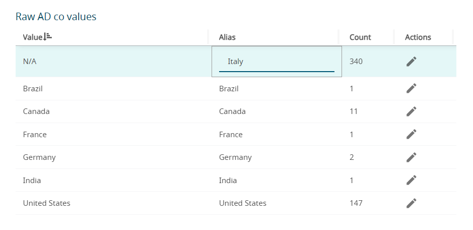 The changes to the attributes values are in the local copy of the AD directory.Tip: It is recommended that the updates are done individually for each attribute, so that it is verified before it is used in the reports. - Click Alias column of the