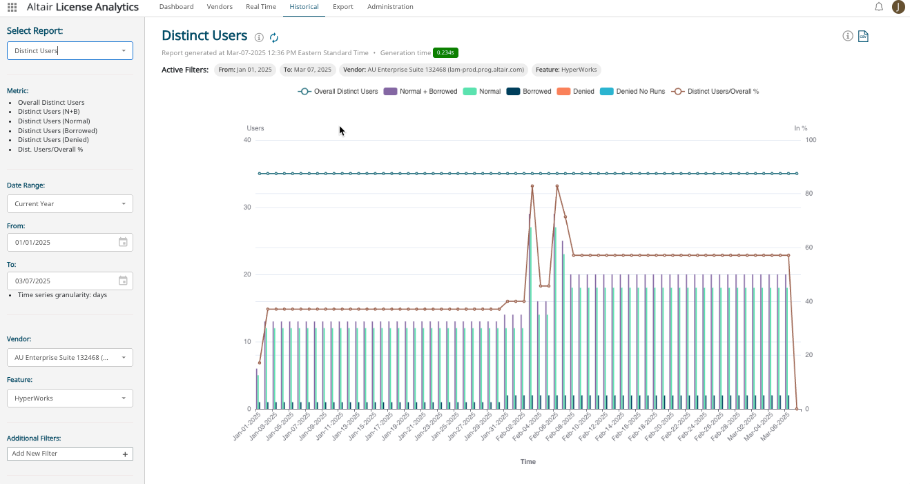 This report presents, for a given licensed software feature, the number of distinct users observed over time.