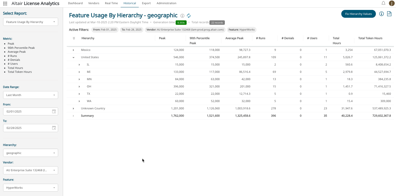 This report presents various metrics segmented by hierarchy for a specified time period for a given vendor/feature. To generate this report, you must define at least one hierarchy using the Organizational Hierarchy module.