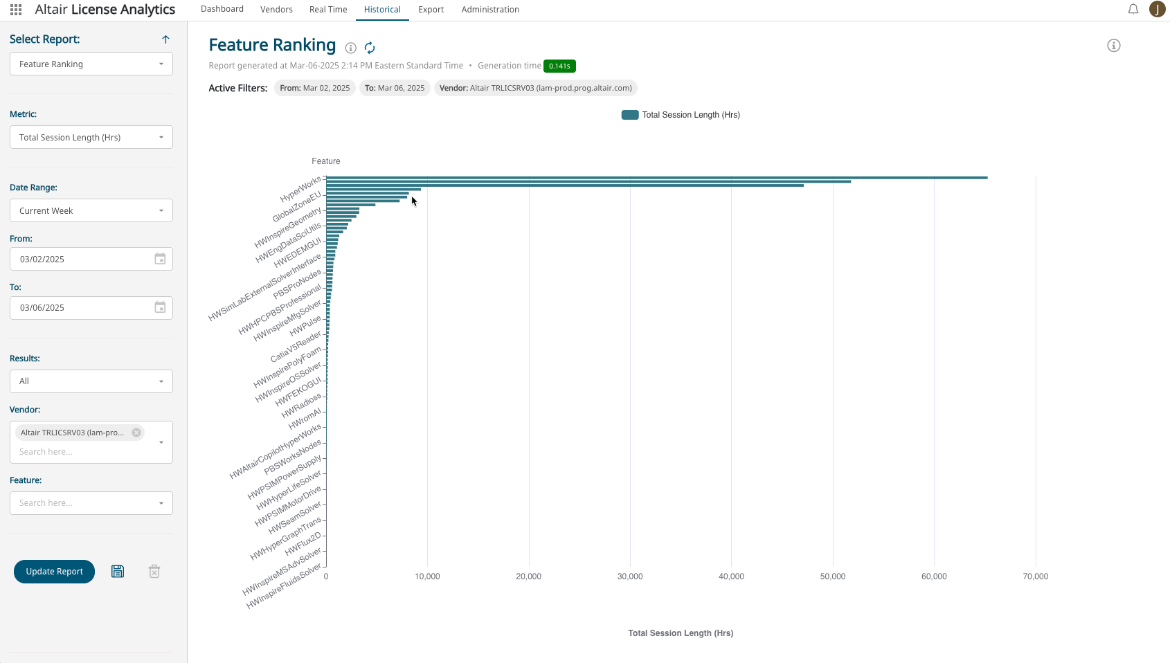This report presents a ranking chart of features based on usage hours for a specific vendor.