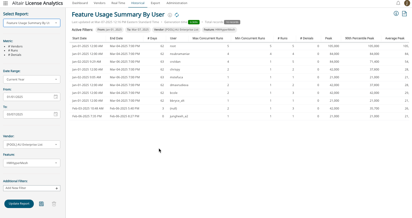 This report presents usage metrics KPIs for a given licensed software feature, segmented by users, such as peak usage (maximum, percentile, and average), peak duration, maximum and minimum number of concurrent checkouts, number of checkouts, denials encountered, total usage hours, average session lengths, etc.